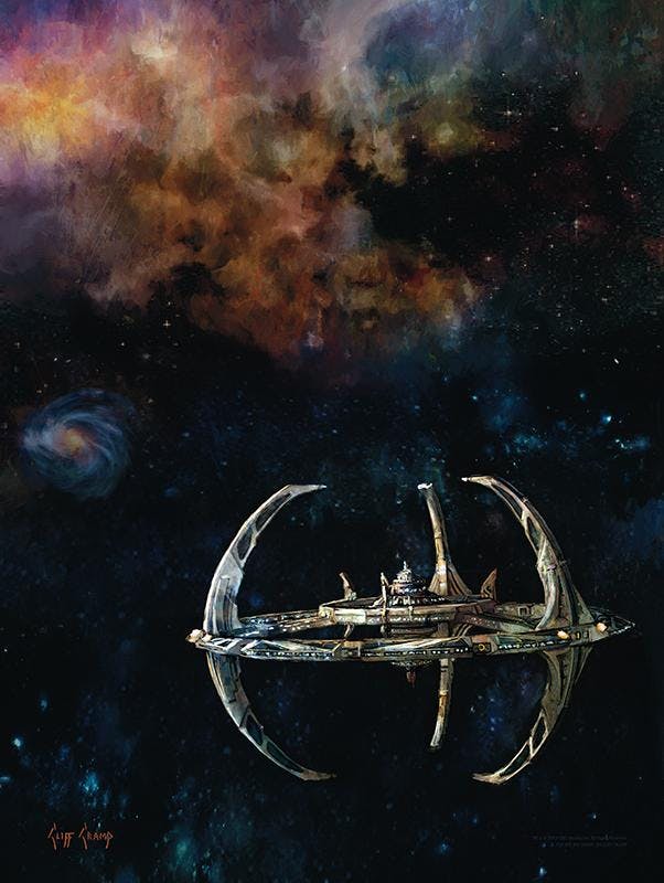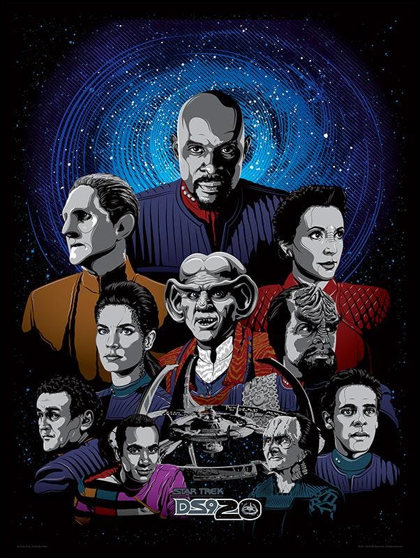 Bye Bye, Robot has just unveiled a trio of Star Trek posters, two of which celebrate the 20th anniversary of Deep Space Nine. First up is “DS9 20,” by returning Bye Bye, Robot artist Tracie Ching. An 18”x24” lithograph on 100-lb paper, it depicts key DS9 characters positioned around the titular space station, with a wormhole looming in the background.