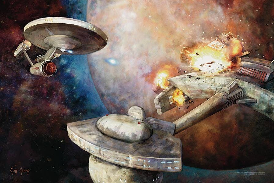 The other two pieces, both by Bye Bye, Robot newcomer Cliff Cramp, are titled “Deep Space Nine” and “A Good Day To Die.” The former measures 18”x24” and shows Deep Space Nine floating in space, with a wormhole forming off in the distance. “A Good Day To Die” measures 16”x24” and makes use of Cramp's signature touch – deep colors – to realize a battle between the U.S.S. Enterprise and a Klingon battle cruiser.