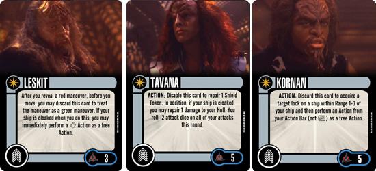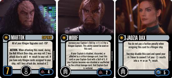 Martok, himself, is a level 7 Captain who reduces the cost of all other Klingon upgrades. Additionally, when attacking, Martok allows the player to take an action to roll 2 less attack dice to add 1 hit result to his roll. In true Klingon spirit, if all upgrades on this ship are Klingon, you roll only one less attack die to gain 1 hit result instead. First Officer Worf provides a +1 bonus to your captain skill, which increases to +3 if you have a Klingon Captain. Simulating the near mutiny on Rotarran if your captain is ever disabled or discarded, Worf becomes the new captain with a skill level of 5. Worf cannot benefit from his special ability that increases the captain’s skill value if he himself becomes the new captain. Serving as Science Officer aboard the Rotarran, Jadzia Dax helped to restore Klingon pride and spirit to the crew. Jadzia Dax allows you to spend a scan token to convert 1 battle stations result on your die into a hit or evade result. Talk about turning the tide of battle. Considered to be one of their own, Jadzia Dax does not pay a faction penalty when assigned to a Klingon ship.