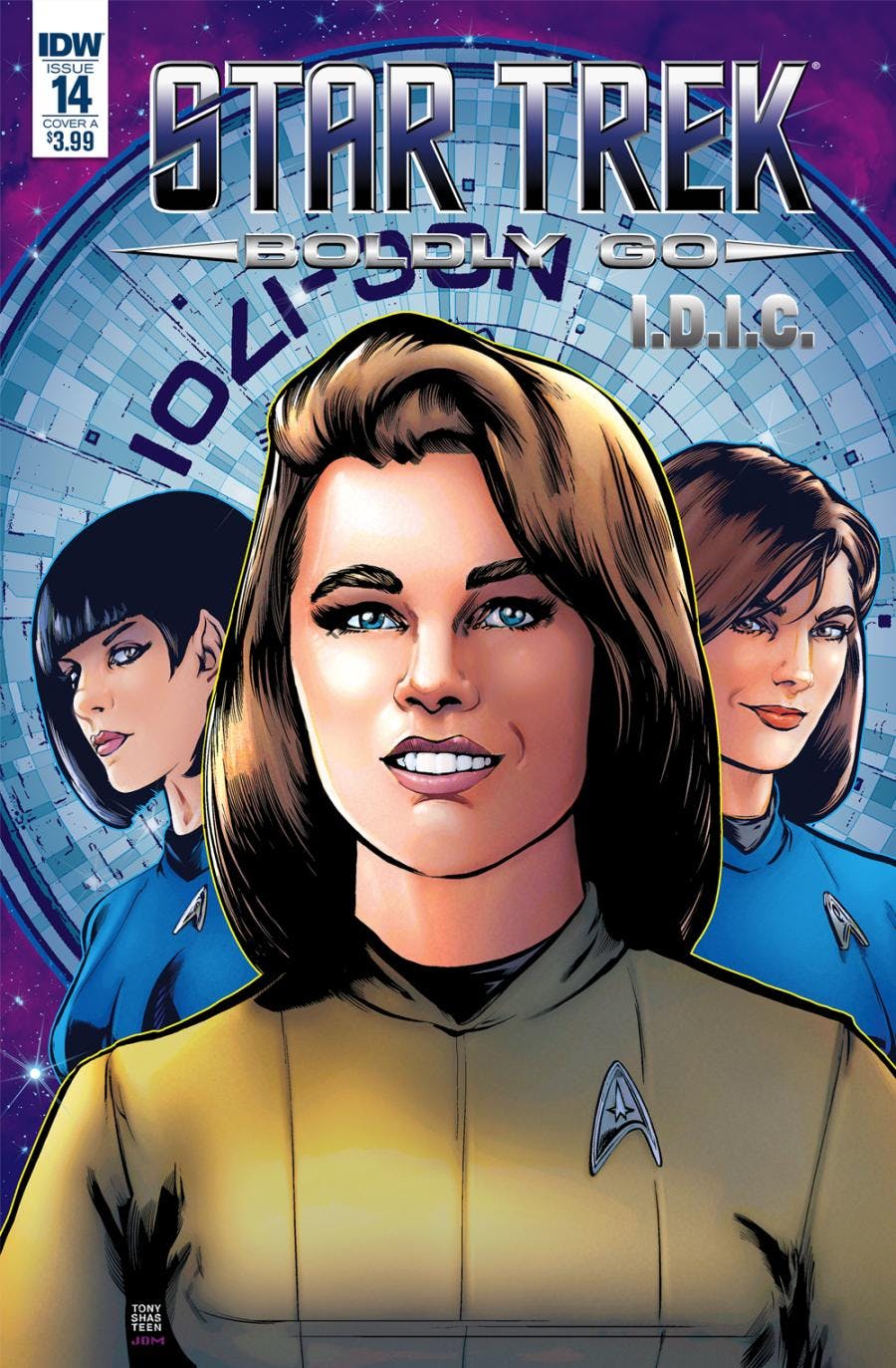 Star Trek: Boldly Go #14 is... "I.D.I.C." The epic Star Trek event continues with part two of six, as Kirks, Spocks and crews from multiple parallel universes collide. Infinite Diversity in Infinite Combinations spells infinite danger to all! The book is written by Mike Johnson, with art by Megan Levens, with an A cover version by Tony Shasteen and a B cover version by Piotr Kowalski. "I.D.I.C." Part 2 of 6 will run 32 pages and cost $3.99. Also, be on the lookout for a variant cover by Yoshi Yoshitani.