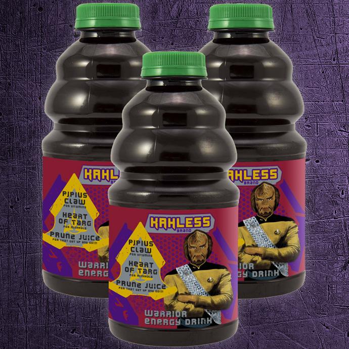 According to Kahless Brand, their Warrior Energy Drink provides "Honor: on the GO!" And it features, as the bottle's label boasts, "pipius claw for vitamins, heart of targ for minerals and prune juice for that get up and GO!!!!"