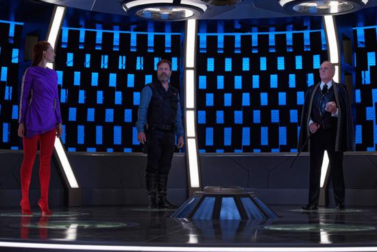 Science Specialist Michael Burnham, Lieutenant Paul Stamets (Anthony Rapp), Harry Mudd and Captain Gabriel Lorca (Jason Isaacs)