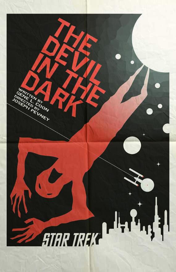 So, have you bought some Star Trek wine for family and friends yet?ORTIZ: Not yet. I did purchase the sampler, one of each, for myself.OK, up first among this month's TOS Art Prints is "The Devil in the Dark." It's very stark and creepy. What were you aiming for with this one?ORTIZ: I always try to design a poster with a new viewer in mind. Elements from the episode are there, and they're just placed into a design that gives an expression of space rather than being underground.