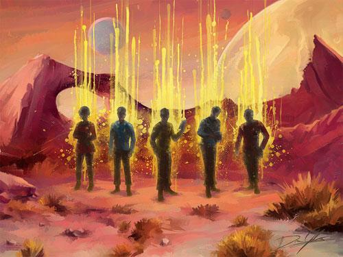 If you’re into colorful Star Trek art, then Bye Bye Robot has two new posters that you should be sure to check out. First up is “Landing Party,” a TOS-themed piece that depicts the main crew beaming while on an away mission. The artist, Drew Johnson, has given the transporter beams a unique flourish, using splashes of yellow to do so.
