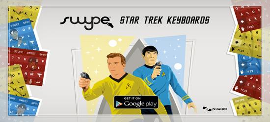 Available tomorrow for in-app purchase will be 19 Star Trek-branded Swype for Android keyboards. The designs feature characters and images from Star Trek: The Original Series and Star Trek: The Next Generation, including Captain Kirk, Mr. Spock, Sulu, Data, Worf, the Enterprise and more.“The latest Swype keyboard for Android demonstrates that the keyboard experience goes beyond just the words on the screen, with more options for users to incorporate their personalities and interests,” said Scott Taylor, senior vice president, Mobile Devices, Nuance. “So while we continue to innovate our pioneering predictive input and intelligent tracing technology, we’re also focused on equipping Swype with new features and options to give consumers the best possible experience on Android.”