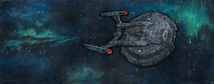 “NX-01, by artist Charity Wood, is the second new poster. It boasts the same extra-wide size (14”x36”) of her other ship portrait print, “Boldly Go.” Bye Bye, Robot’s first Star Trek: Enterprise print, it features a three-quarter top view of the iconic ship as it banks through a turn as it begins its journey. Wood’s signature style, combined with the detailed rendering of the “NX-01,” lends this ship portrait a unique feel. Further, Wood employs deep, rich colors and sets the NX-01 atop a stylized star field filled with distant aqua-colored nebulae, making the ship stand out as the fearless space traveler that it is.