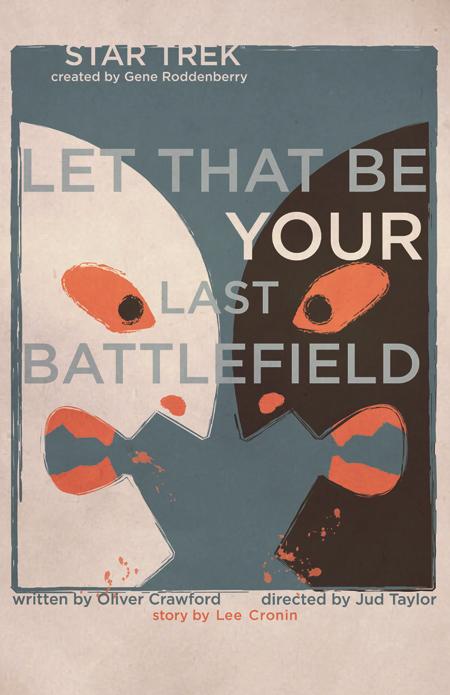A lot of people will be surprised to see so much color in the print, since the Tribbles were pretty muted in color. What led you to go that route?Ortiz: Despite what it looks like, the Enterprise is not beaming hundreds of Tribbles into space. The Enterprise is metaphorically bleeding Tribbles. I wanted the poster to be fun and colorful, and (to) hopefully make people smile. What were you aiming for with “Battlefield”?Ortiz: Before I upset any fans, I intentionally flopped the colors so that the white and the black could face each other. Although the two antagonists are from the planet Cheron, I wanted to depict any race on any planet where there is race hatred.