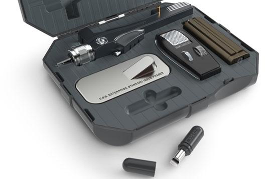 The Phaser was created from meticulous 3D scans of the last-known TOS hero prop and is a fully functional, gesture-based universal remote control that can be used to control many home entertainment systems and other IR-controlled devices. The 1:1-scale Phaser is equipped with 10 authentic phaser firing sounds, a customizable personal lock code, tactile force-feedback, and it can store up to 36 remote commands.