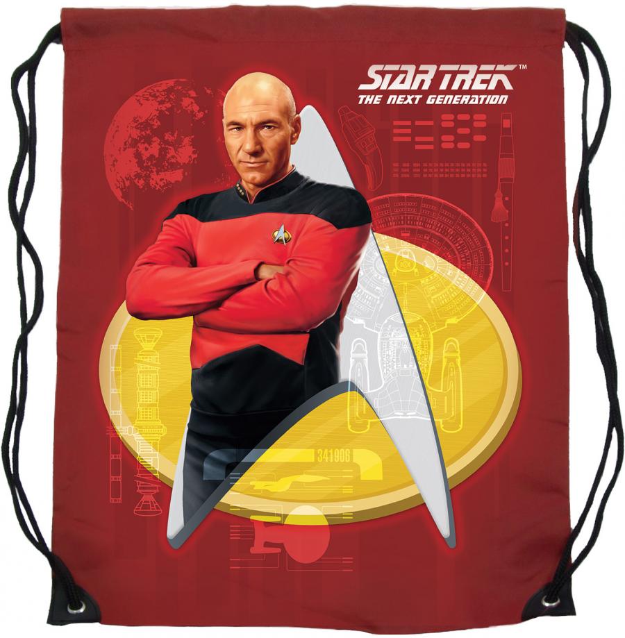 The Coop has just introduced a pair of new Star Trek products, and StarTrek.com has an exclusive First Look. The two TNG-themed products are a Captain Picard Cinch Bag and a Lt. Commander Data Cinch Bag. Each product measures 17" high by 13 1/4" wide is made of durable polyester with a heat transfer print and reinforced bottom PU corners with grommet for straps. The Picard bag is red and features an image of the captain with his arms crossed, while the Data bag is gray and features an image of everyone's favorite android wielding a phaser.