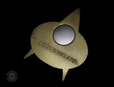 You want to beam up, but can’t. You want to confer to Captain Picard, but you’re missing something. Well, now that something – a Star Trek: The Next Generation Communicator Badge – is almost within reach. QMx will offer the badge next year, but we thought we’d give you a First Look right now.The upcoming badge is extraordinarily screen-accurate, as QMx crafted it using one of the only remaining sets of original molds, which were painstakingly restored in their artisan model shop. That restoration process enabled them to precisely replicate the prop’s shape and size. To perfect the colors, the design team studied an actual screen-used badge. And then QMx went where no badge-maker has gone before: rather than use painted resin, as was done on TNG, they rendered the replica props in gold- and silver-finished metal. Finally, to finish off the piece, QMx added short-field magnets – rather than a pin clasp – enabling fans to wear their badge without putting holes in their clothes.