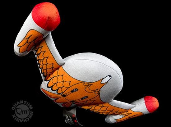 Introducing the Romulan Bird-of-Prey Plush toy from Qmx. The plush boasts the familiar cool gray hull with a glorious golden-orange bird in flight depicted on the underside. The chibi-style ship measures approximately 6.75 inches long, with a wingspan of 9.5 inches from nacelle to nacelle. Just to keep everyone safe, Qmx has skipped the plasma torpedoes and nuclear weapons. It costs $14.95. Visit QmxOnline.com to purchase.