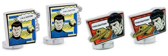 Looking for a cool but subtle way to show off your love of Star Trek? How about Star Trek cufflinks? CuffLinks.com is offering four new sets of colorful, comic-inspired Star Trek cufflink sets, including Bones "I'm a Doctor," Spock "Fascinating," Captain Kirk Action and Spock Action. The cufflinks are silver plated with enamel, feature a comic printed image and fixed back closure, and ship in themed packaging that's ideal for either storage or display.