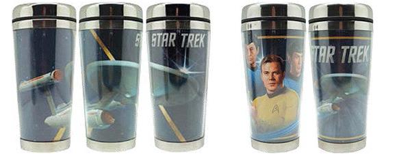 Next up are two Star Trek 6 oz. acrylic/stainless steel travel mugs, each of which measures 7 inches tall. The first mug depicts the Enterprise in space and features the TOS logo, while the second mug is Starfleet-themed and features images of Kirk, Spock, McCoy and Enterprise, as well as the TOS logo. Each mug will cost $14.99 and will be available in March.