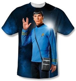 “Live Long and Prosper has been an adage rolling off tongues effortlessly since the episode ‘Amok Time’ first brought it to our Earthly ears. Often paired with the Vulcan salute, Live Long and Prosper is a maxim that gives us an ideal to strive for and wishes us the best in our journeys to come in four simple words. This shirt proudly displays Spock giving the peaceful salute and will hopefully be a reminder to all who view it that we could use a little more logic and positivity in our lives.”
