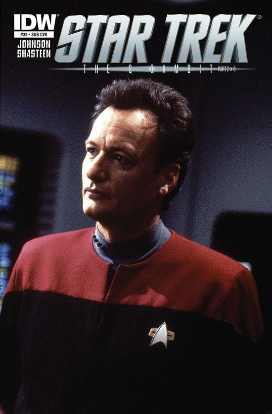 IDW Publishing will heat up the summer with a trio of Star Trek comic books set for release in August. StarTrek.com will preview the titles over the next few days, and we start today with Star Trek #36, the second part of the “The Q Gambit” adventure by writer Mike Johnson, collaborating once again with Tony Shasteen (art and cover) and Roberto Orci (who oversees the Trek comics set in the universe of the current films). In Star Trek #36, Kirk and the Enterprise crew are thrust into the future of their new timeline thanks to Star Trek: The Next Generation’s mysterious, impish being known as Q. But in this alternate reality, what has become of the space station once known as Deep Space Nine... and the man called Benjamin Sisko?