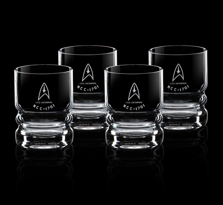 They’re great for toasting. They’ll hold your Romulan Ale, Saurian Brandy, Scotch or Altair Water, and of course your OJ or milk, too. They’re microwave safe, dishwasher-safe and even replicator-safe. They’re the four etched glasses that comprise ThinkGeek’s Star Trek U.S.S. Enterprise Glassware Set. Each glass weighs 8 ounces and has a 7-ounce capacity, and the glasses are etched with the Starfleet Command Division Insignia and the ship's name and registry.