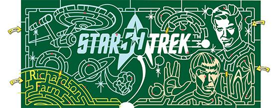 As previously reported here at StarTrek.com, this is Richardson Farm’s 16th maze. Previous maze themes have honored milestones for the Chicago Blackhawks, Star-Spangled Banner, Beatles, Boy Scouts, Girl Scouts, Military Veterans and even “The Race to the White House” back in 2008. The lush green 28-acre cornfield is sculpted with 11 ½ miles of trails that in addition to to Spock, Kirk, the Trek 50 lgo and the Enterprise, depict an array of planets, asteroids, comets and stars. Take a whopping 21 football fields, arrange them in one giant rectangle, and that’s the size of the Trek maze.