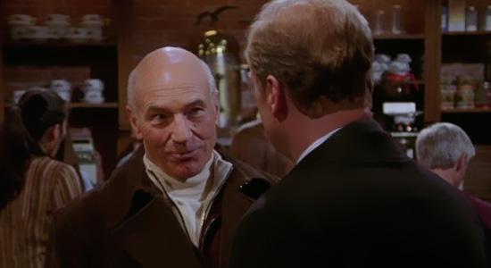 Spinoff Frasier saw even more visits by Trek regulars. Star Trek: The Next Generation’s Patrick Stewart and Brent Spiner made separate appearances during the 2003 season. Stewart’s memorable guest turn was as famed fictional director Alistair Burke in “The Doctor is Out” and Spiner played Albert, an airplane passenger seated next to Lilith (“Lilith Needs a Favor”). There is a subtle reference to Data’s countenance when Lilith comments about Albert’s pale complexion, and Albert states, “I am always this pale.” Star Trek: Deep Space Nine’s Rene Auberjonois (Odo) played Frasier’s mentor, Dr. William Tewksbury, in two episodes. Voyager’s Robert Picardo (The Doctor) appeared in “Bully for Martin,” playing a role that would’ve made Tuvok proud (if Vulcans felt pride, that is) – that of Charlie Koechner, a security specialist.Star Trek: Enterprise’s Anthony Montgomery (Travis) had a role as a waiter in “Something Borrowed, Something Blue.”