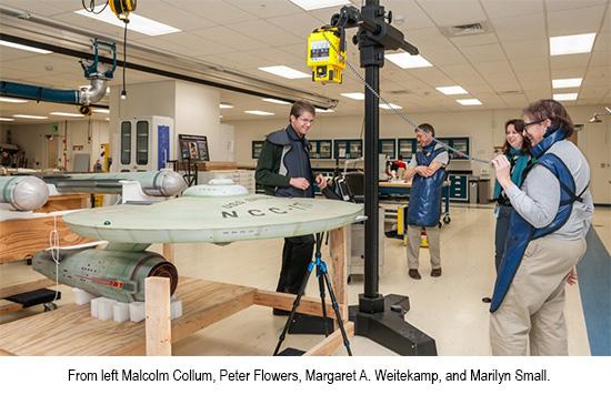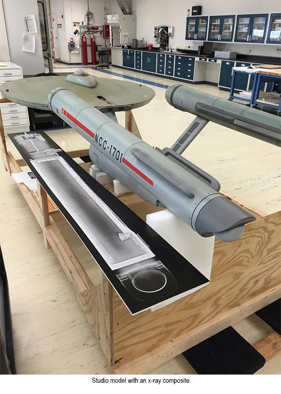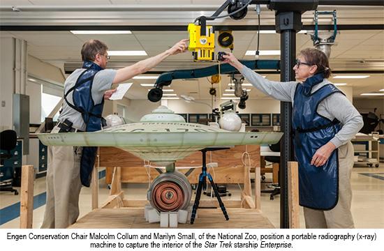 As the Museum is assessing the 11-foot studio model of the Star Trek starship Enterprise, we’re trying to provide occasional updates to the many fans of this iconic artifact of American culture. The shooting model, which has been in the Museum’s collection since 1974, was removed from public display in September 2014 in order to be assessed and prepared for exhibit in the Boeing Milestones of Flight Hall, opening in July 2016. Right now, the Museum is completing a painstaking process of analyzing the model.Notably, conserving the Star Trek starship Enterprise studio model has allowed some wonderful cooperation between different branches of the Smithsonian institution. In December 2014 and again in January 2015, Tangara Cross of the National Zoological Park arranged for Marilyn Small and Peter Flowers, two National Zoo registered veterinary technicians (and Star Trek fans), to come to the Steven F. Udvar-Hazy Center in Chantilly, Virginia, to examine the model used in filming of the original Star Trek television series (1966–1969).