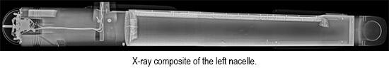 Working slowly, the participants planned the exposures to allow the images to be “stitched” together so conservators can get a more complete picture of the artifact. Our photographer, Dane, advised on how best to overlap the images so that they could be matched once the images had been taken back to a zoo computer to be processed. The composite image of the left nacelle shown here has been put back together by Museum conservator Ariel O’Connor. When printed at full size, it gives the conservators a clear map of the interior of the model, without disturbing any of the original structure. It’s worth noting how much the technology has improved since the last time the Enterprise model was x-rayed in the 1990s.