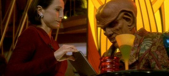 The scene being filmed was Vic’s Lounge, with James Darren and band doing “What You Leave Behind” over and over, so the camera could get shots of all the audience, which seemed to be everyone who ever had anything to do with DS9, including production staff. Several actors usually in alien makeup were finally humans in Vic’s: Max, Aron, J.G. As producer Rick Berman reported, “…A constant stream of well-wishers kept strolling onto the soundstage … everyone was taking pictures and signing each other's script covers. It was like the last day of high school.”