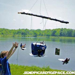 We had a payload that was nearly 10 feet across carrying Captain Picard, Riker and Data aboard the USS Enterprise-D on one side and Captain Kirk, Abrams and Orci aboard the USS Enterprise NCC-1701 on the other. And because it all means nothing unless we have the whole trip documented, 6 HD cameras also went along for the ride, including a 3D camera (special thanks to SanDisk for supplying the high-capacity memory cards we needed!). We also had tracking systems galore: GPS, HAM, cell phones, even Morse code.