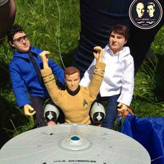 The idea began to expand: if we're going to send Picard, let's send him atop of the Enterprise-D and send Riker and Data, as well! And let's also send Kirk and the NCC-1701 and the two leading men behind the 2009 Star Trek movie, J.J. Abrams and Roberto Orci. (I had a doll maker create custom hand-sculpted action figures of Abrams and Orci.)