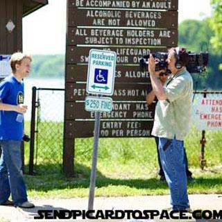 When we arrived at the state park, we were met with the option of either launching from the parking lot or a nice green field on the other side of a fence that was locked and said "closed" on a nice, big sign. Because lush green field looks a lot better on camera than an old parking lot, I told everyone to jump the fence and set up in the field. About an hour later, I spotted Spencer down the road talking to the park ranger. Apparently, there needed to be a lifeguard/attendant on-duty in order to be permitted in the area we were in because it was aside the lake, despite no intentions of going in the water. I managed to convince the park ranger to give us an hour.
