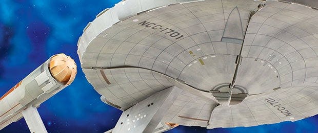 Haynes has just introduced the latest in its long line of Star Trek manuals, and it's called Haynes USS Enterprise Press-Out & Build Manual. Out now in the United Kingdom, it features facts, photos and detailed cutaway drawings of the legendary Trek ship on printed die-cut sheets that can then be pushed out and connected to construct a scale model of the Enterprise that will measure 50 centimeters long. No glue or scissors are necessary to build the Enterprise, and the manual comes with both instructions on how to build the model and a loop for hanging the finished Enterprise from the ceiling.