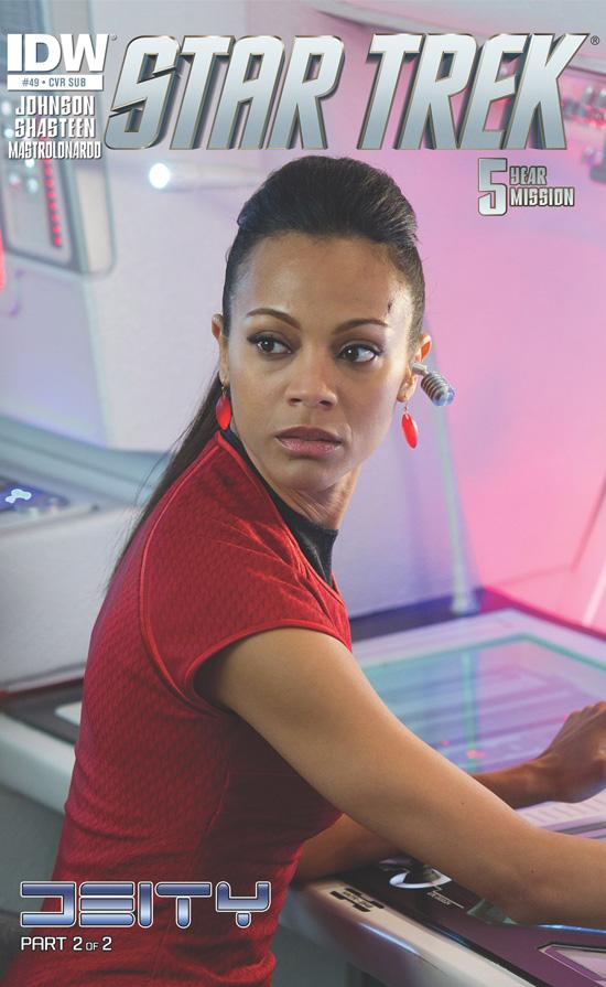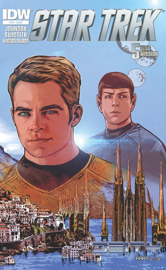 Star Trek #49, out on Wednesday, will continue IDW Publishing's Five-Year Mission adventure. Written by Mike Johnson and featuring art and a cover by Tony Shasteen, #49 will conlcude the epic "Deity" two-parter. In it, Captain Kirk, up against a fierce new enemy, must choose between sacrificing his ship and crew or allowing an innocent species to perish.