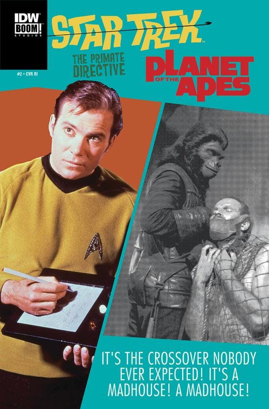 Star Trek/Planet of the Apes #2 (of 5) will run 32 pages and cost $3.99. The crossover will feature an essay about Trek and Apes by comedian/fan Dana Gould, and readers should be on the lookout for a subscription variant cover by Joe Corroney.