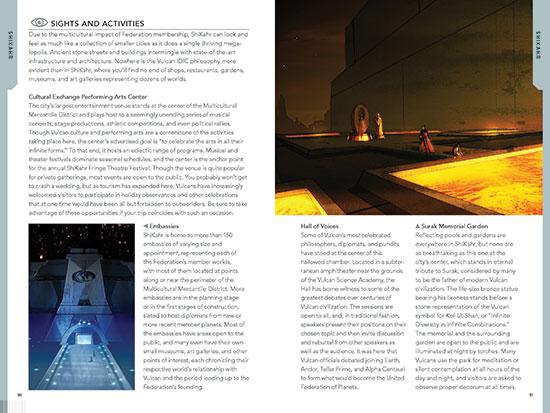 And, once again, here's the synopsis from Insight Editions:Plan your next trip to the planet Hidden Universe Travel Guide: Star Trek: Vulcan! Find restaurants that serve the best fried sandworms and Vulcan port. Take a trip to the Fire Plains or experience spring break at the Voroth Sea. Learn all about the native Vulcan people and their unusual customs. Discover how to correctly perform the traditional Vulcan salutation (you really don’t want to get this wrong). Learn key Vulcan phrases such as Nam-tor puyan-tvi-shal wilat: “Where is your restroom?” Find out what to do if you suddenly find yourself host to a katra—a Vulcan’s living spirit—at an inconvenient moment. All this and more can be found within the pages of this essential travel guide to one of the most popular—and logical—destinations in the known universe.