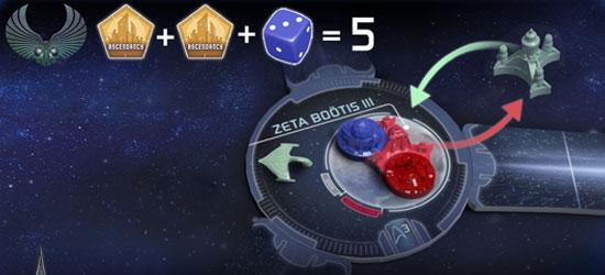 is very simple. Both players involved roll a number of dice equal to the number of Starships involved in the battle. On each player’s Control Console, the Weapons System slider will point at the number a player needs to roll to hit and destroy a rival vessel. An opponent’s Shields can modify that number, making the “Hit Roll” more difficult. After a round of combat, any Ships that were destroyed are removed from the game board. If there are still Ships left to continue the fight another round combat ensues unless one of the participants choose to retreat.A Planetary Invasion works much the same as Space Combat, except the invading Ships roll off against the structures built on the planet. The results of an Invasion are bit different than a Space Combat. If the Attacker rolls more hits than the Defending Planet has structures, then the Attackers take the world intact; taking over the existing Resource Nodes for themselves. If the Attacker rolls Hits equal to or less than the number of Nodes on the planet, those structures are destroyed. Only the Attacker may retreat from a Planetary Invasion. Taking a planet intact is a huge boon for the invading player.A Planet may be convinced to join your civilization through diplomatic means by way of a Hegemony Roll. This roll represents the lengthy negotiations and treaties required to convince a world to join the larger galactic community. When a Hegemony roll is attempted, not only must a player issue a Command, but they must pay a Culture Token as well. Only the player making the Hegemony attempt makes a roll, with the target number being the sum of Planet’s Ascendancy (if it’s controlled by a rival player) or by its Warp-Capability plus the number of Structures on the world. If the player rolls more than the target number, they may spend another Culture Token to place a Control Node on the planet, taking control of it in the game. If they fail the roll, negotiations breakdown and another attempt must be made later to bring the planet into the fold. While challenging, adding worlds to you civilization through Hegemony means they contribute to your growth immediately with spending additional resources.What will be your orders when you take command Star Trek: Ascendancy? For an in-depth look at the commands you can issue in the game visit www.startrek.gf9games.com. Also learn about the special limited set of 50th Anniversary Exploration Cards, inspired by The Original Series, in specially marked boxes of Star Trek: Ascendancy.