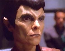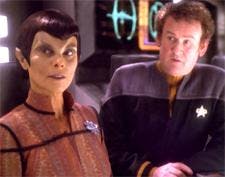 BARBEAU: No, actually, it wasn’t. They’d been doing it for so many years by the time I was on Deep Space Nine that I think they really had it down to a science. Mostly it was airbrushing and the wig. It seems to me that it went on very easily. I don’t remember how easily it came off, but I don’t remember any pain or suffering getting it on.