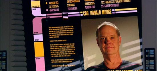 MOORE: Usually on a daily basis! It was funny, I recently did a convention and was on a panel with Doug Drexler. The program had me listed as Ronald D. Moore. Ron is a really great guy and I can think of worse people to be confused with. It is strange that now and again someone will come up with a picture of Ron D. and ask me to sign it. Clearly I look nothing at all like Ronald D. Moore. But rather than point it out I just sign it the other Ron. We are forever connected. I hope he has as much fun with it as I do. I told him once that I picked up copies of one of his books and signed them and gave them to friends and that I hoped he didn’t mind. He said he was OK with it, but that he told people he had an Emmy! Funny. I hope he gets one for his new show Outlander, as it is outstanding.
