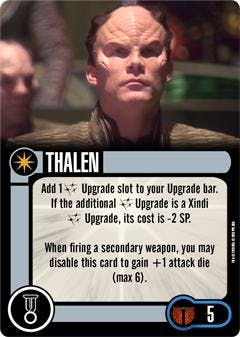 Thalen is one of two Elite Talent Upgrades found in the Orassin Expansion Pack. Thalen adds 1 Weapon Upgrade slot to your Upgrade bar. If the additional Weapon Upgrade is a Xindi Upgrade, its cost is -2SP. When firing a secondary weapon, you may disable this card to gain +1 attack die (max 6). The Xindi have plenty of Weapon Upgrades to choose from and discounted Xindi weapons that can add +1 attack die make this Elite Talent something to consider as part of your next Xindi Fleet.