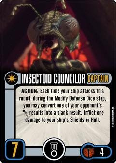 The Captain in the Orassin Expansion Pack is Insectoid Councilor. A level 7 Captain Insectoid Councilor allows you to convert one of your opponent’s Evade results into a blank result each time you attack. Afterwards you must deal one damage to your ship’s Shields or Hull.