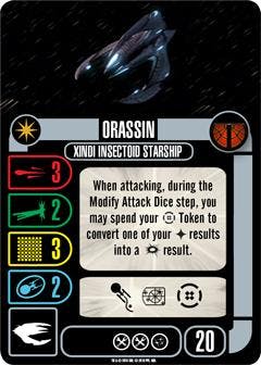The stats for the Orassin are identical to the Diaspora, which was previously only available as an organized play prize. The special ability on the Orassin allows you to spend your Battle Station Token to convert one of your hit results into a critical hit result when attacking. This ship gives you the potential to strike hard when you need it most. The Xindi-Insectoids are known for being ruthless and, with a little luck, you might even cause a Warp Core Breach.