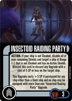 Insectoid Raiding Party is a Crew Upgrade that allows you to discard this card in order to discard any Upgrade with a cost of 5 SP or less on the target ship when that ship is within Range 1-2, is not cloaked, and has no Active Shields. In order to perform this action your own ship must also not be cloaked and you have to disable all of your remaining Shields. For only 3 SP this upgrade can be a great way to deal with troublesome upgrades like Cheat Death.