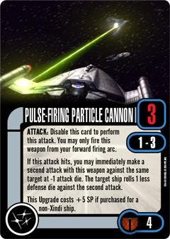 Pulse-Firing Particle Cannon is a Weapon Upgrade that allows you to immediately make a second attack with this weapon against the same target at -1 attack die if the first attack hit. The target ship rolls 1 less defense die against the second attack.