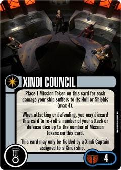 Xindi Council is the other Elite Talent in this Expansion Pack. Place 1 Mission Token on this card for each damage your ship suffers to its Hull or Shields (max 4). When attacking or defending, you may discard this card to re-roll a number of your attack or defense dice up to the number of Mission Tokens on this card. Combined with Insectoid Councilor, you can both reduce the Evade results your opponent rolls and help get Mission Tokens onto this card quicker.