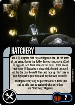 Hatchery is the final upgrade in this Expansion Pack. This Tech Upgrade costs 2 SP and adds 1 Crew Upgrade slot to your Upgrade Bar. At the start of the game, place a Xindi Crew Upgrade face down beneath this card. When one of your other Crew Upgrades is discarded, discard this card and flip the card beneath this card face up. That card is now deployed to your ship and maybe used normally.