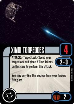 Xindi Torpedoes are the Xindi’s version of Photon Torpedoes. This Xindi weapon costs only 2 SP and can be fired at Range 2-3 for 4 attack dice. 3 Time Tokens are placed on this card when you perform this attack.