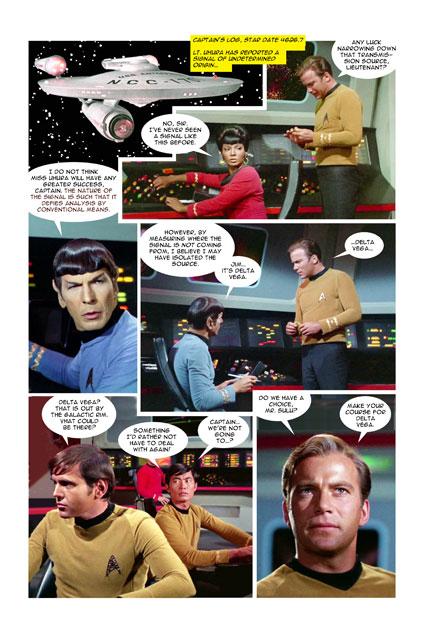 John Byrne, the prolific comic book writer and artist, will return to the Star Trek fold in December with “Strange New Worlds,” IDW Publishing’s Star Trek Annual 2013. “Strange New Worlds” will be a “photonovel” with an original story that plays out like a lost episode of The Original Series. “Strange New Worlds” picks up right where the TOS hour “Where No Man Has Gone Before” left off and carries on the saga of Kirk’s friend Gary Mitchell, who died in the second TOS pilot. But did he really? To tell the story, Byrne put a fresh twist on the old photomontage concept, in which actual film stills replaced traditional artwork. Here, he enhances the “fumetti” style by compositing together numerous pieces of film stills and manipulating them as he saw fit.