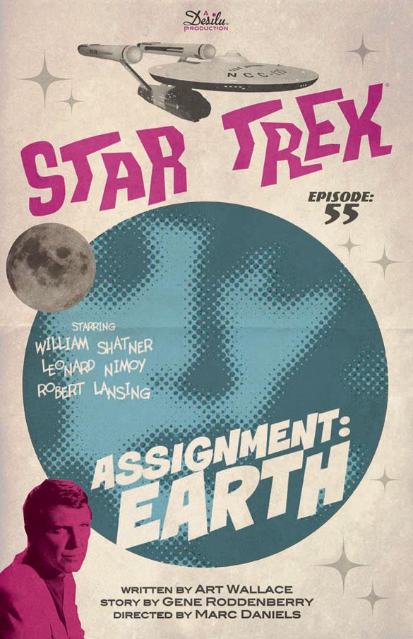 We very rarely see guest star names on the posters. Was adding Jeffrey Hunter your choice or a contractual situation with CBS and his estate?ORTIZ: I felt that Jeffrey Hunter deserved credit for the integrated scenes from "The Cage," which he had starred in. The “Assignment: Earth” print feels like a comic book cover. Episode 55 could even be the price, so to speak. Are we seeing that correctly?ORTIZ: It started out actually as an old 40's serial poster. The serials had posters with the chapter or episode numbers on them. It ended up having more of a 70's punk band feel, with the lack of background color and collage elements.