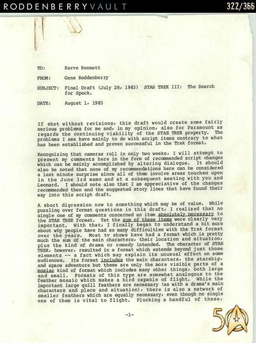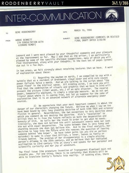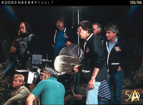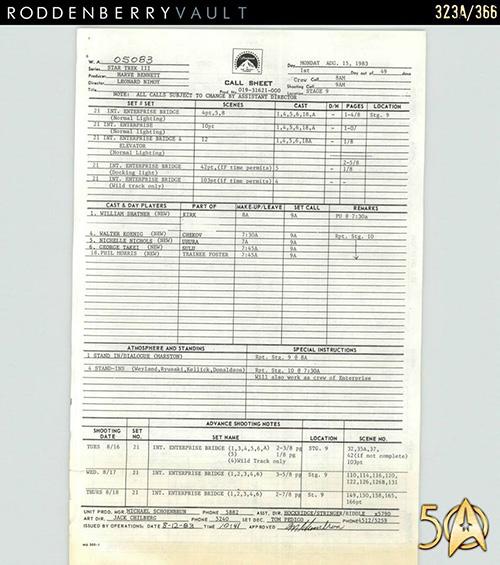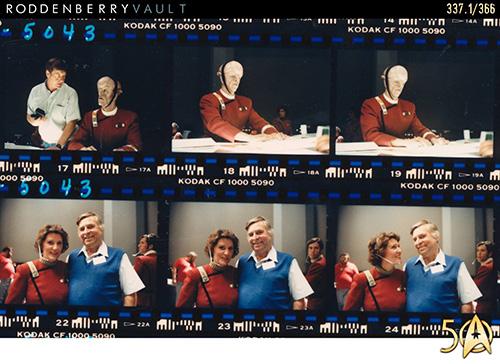 StarTrek.com is pleased to once again share the latest photos from the 366 Project at the Roddenberry Vault. The latest photos include James Doohan attending the premiere of Star Trek: The Motion Picture, a pipe-smoking crewman lighting Kirstie Alley for a scene from Star Trek II: The Wrath of Khan, page one of a letter from Gene Roddenberry to Harve Bennett voicing his concerns about elements of the Star Trek III: The Search for Spock script, a Star Trek III call sheet, Nimoy behind the camera on Star Trek III, a black and white contact sheet from Star Trek IV: The Voyage Home, William Shatner reading a Star Trek: The Original Series script while on a motorbike, a color Star Trek IV contact sheet featuring images of Michael Berryman and Majel and Gene Roddenberry, a Star Trek IV black and white contact sheet with shots of Majel Roddenberry and Mark Lenard, and an inter-office letter from Harve Bennett to Gene Roddenberry addressing Roddenberry's comments on the then-lastest draft of Star Trek IV.