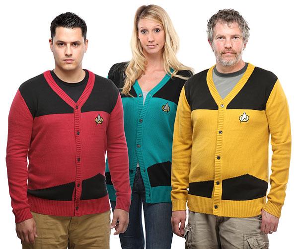 Star Trek: The Next Generation fans -- thanks to ThinkGeek.com -- can finally head to work or to lounge around the house in comfy cardigan versions of their favorite Starfleet uniform. Yes, ThinkGeek has just unveiled a trio of five-button, V-neck cardigan sweaters that feature combadges embroidered in place (so you can't lose them) and come in Sciences Blue, Command Red or Operations Gold.