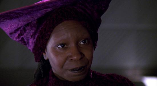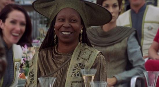 When Goldberg made her first convention appearance at Star Trek Las Vegas in 2016, Guinan’s unique wardrobe came up. Goldberg referred to her outfits as “tents” and told the audience that her trademark large hats were designed to resemble the ship’s saucer section, prompting the other cast members to call her “shuttle head.”