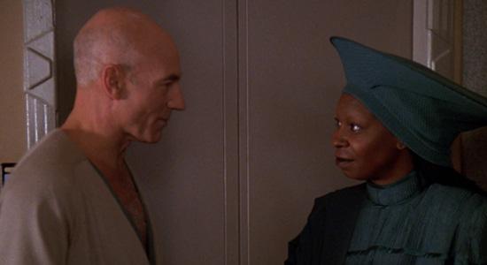 Goldberg left the series in season six, with Star Trek Generations coming out a year later in 1994. Guinan made one more, very brief appearance at the wedding of Will Riker and Deanna Troi in the 2002 film Star Trek Nemesis.