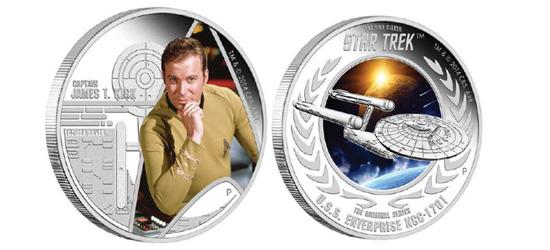 The Perth Mint will honor Star Trek with a pair of limited-edition silver commemorative coins, the first in a new collector series set to launch on February 16. The 1-oz. silver proof coins depict Star Trek: The Original Series-era Captain Kirk and the U.S.S. Enterprise NCC-1701. The reverse of the Kirk coin features a color image of William Shatner as his iconic screen character, while the reverse of the Enterprise coin depicts the United Federation of Planets logo and a color image of the starship flying through space. The inscriptions CAPTAIN JAMES T. KIRK and STAR TREK: THE ORIGINAL SERIES U.S.S. ENTERPRISE NCC-1701, respectively, complete each design with the Perth Mint's traditional "P" mintmark. The obverse of each coin depicts the Ian Rank-Broadley effigy of Her Majesty Queen Elizabeth II, the monetary denomination and the 2015 year date.